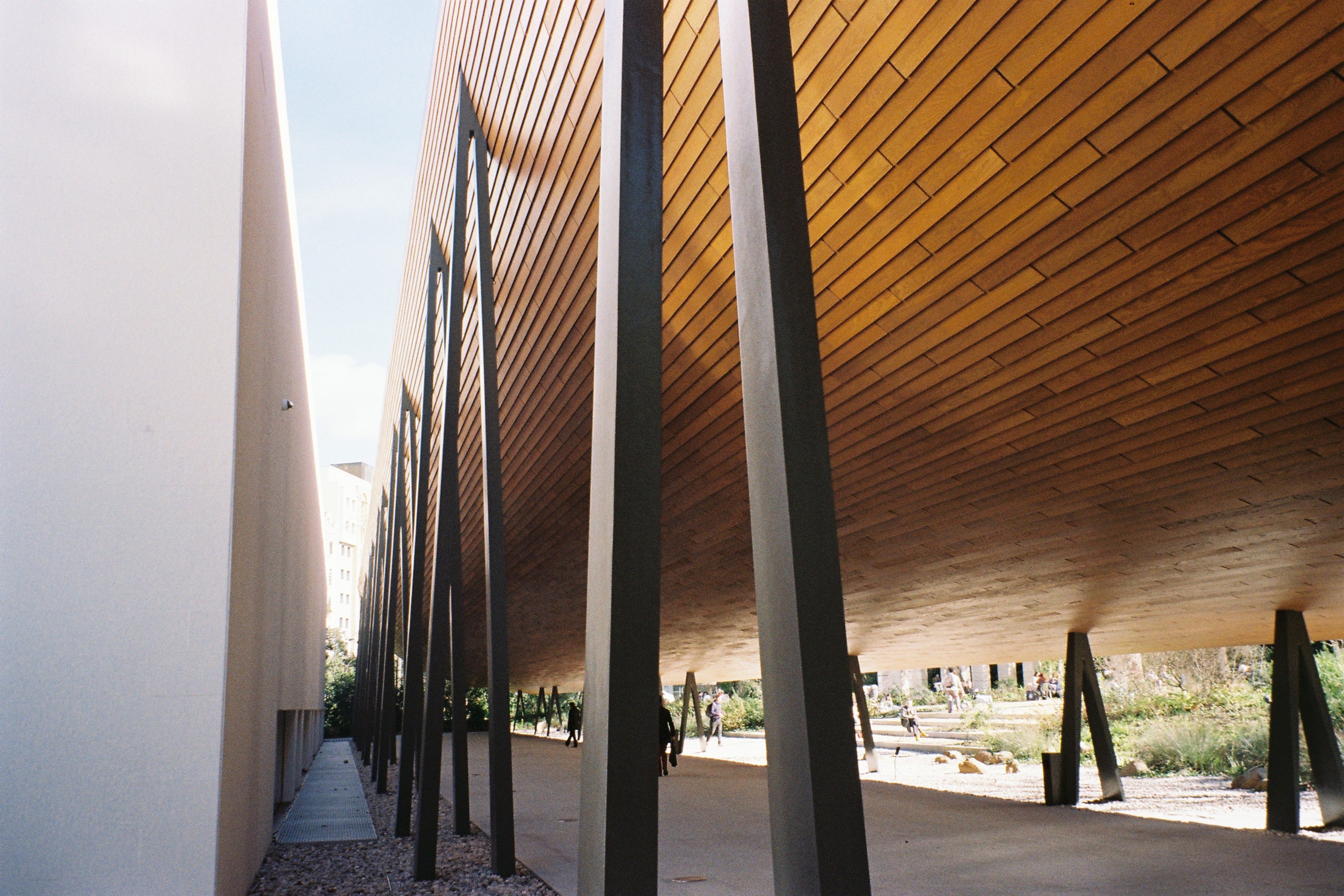 Connection is really important. No connection is created at the Gulbenkian “engawa” because there is no engawa. The purported engawa is not one because 1. it is detached from the building by a significant meter, effectively rendering it a freestanding folly whose huge, inverted-McDonald’s-M-catenary-curved roof is discontinuous with the roof of its adjacent building; 2. along the side where it encounters that building, it slams into a blank wall; and 3. it faces the wrong way. The old building stepped up, north to south, to address the glorious Gulbenkian gardens; the non-engawa turns its back on those gardens and looks south onto a sad bit of grass, swooping from a very high 6 meters by the building to very low 2 meters (by the sad bit of grass) such that the untrained eye perceives it, in perspective, as another blank wall.