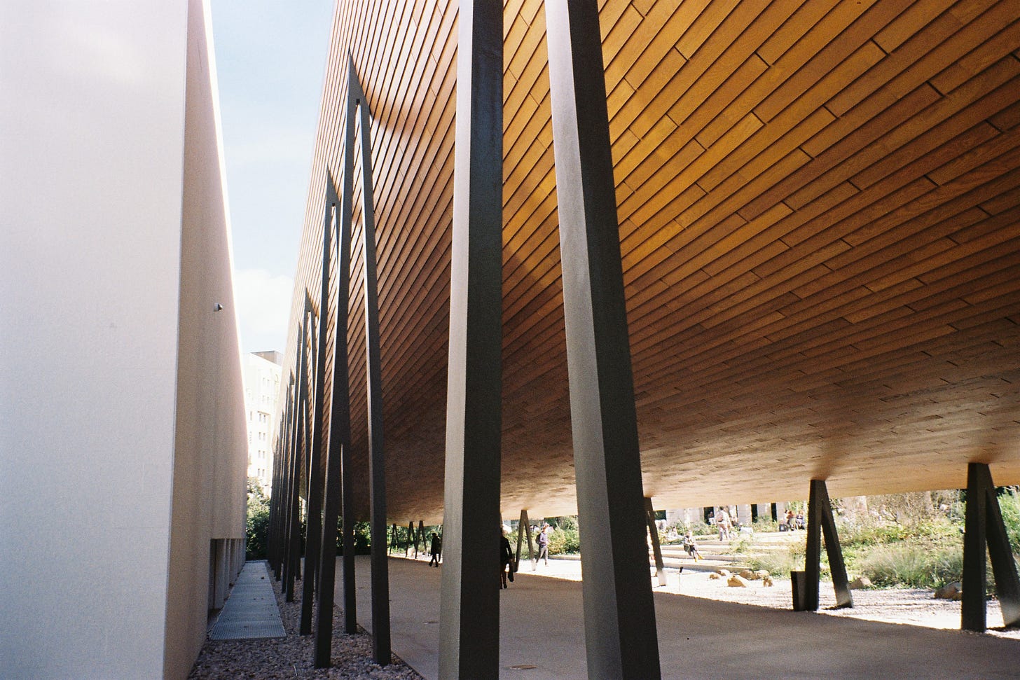 That arena vibed “ecological” thanks to a lot of fussy little woodsy bits, plus very many shrubs in tubs. Because the stadium was really held up by high-carbon and high-energy steel and concrete, this is greenwashing—the dressing up of unsustainable work in eco-friendly disguise. In a formula that Kuma has repeated prolifically, the woodsiness enabled the work to, with minimal actual craft, evoke in modernesque work the profound inheritance of timber in traditional Japanese architecture. At the Gulbenkian, the local harvest of this aura farming is—the museum capitalizes it on their map—the Engawa. This is a Japanese term for what other cultures might call a veranda or a lanai. Historically, the word has described a complex mediation between indoors and outdoors: a raised interior floor stepping down to the ground, past intricately choreographed doors and windows dynamically calibrated by sliding paper and wood screens. This threshold, so deep and variable, becomes its own in-between place—offering both refuge and prospect, inside and outside, and the best of both. “An engawa can create connection,” Kuma told the design press, “and connection is really important for the future [of the] museum.”